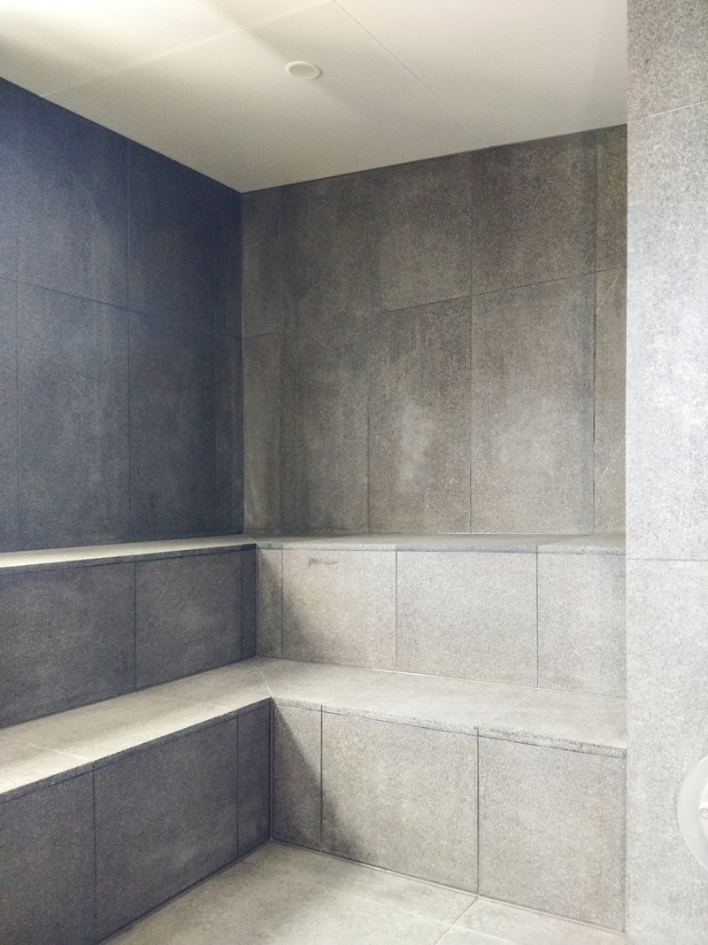 Steam room with natural stone floors and built-in seating.