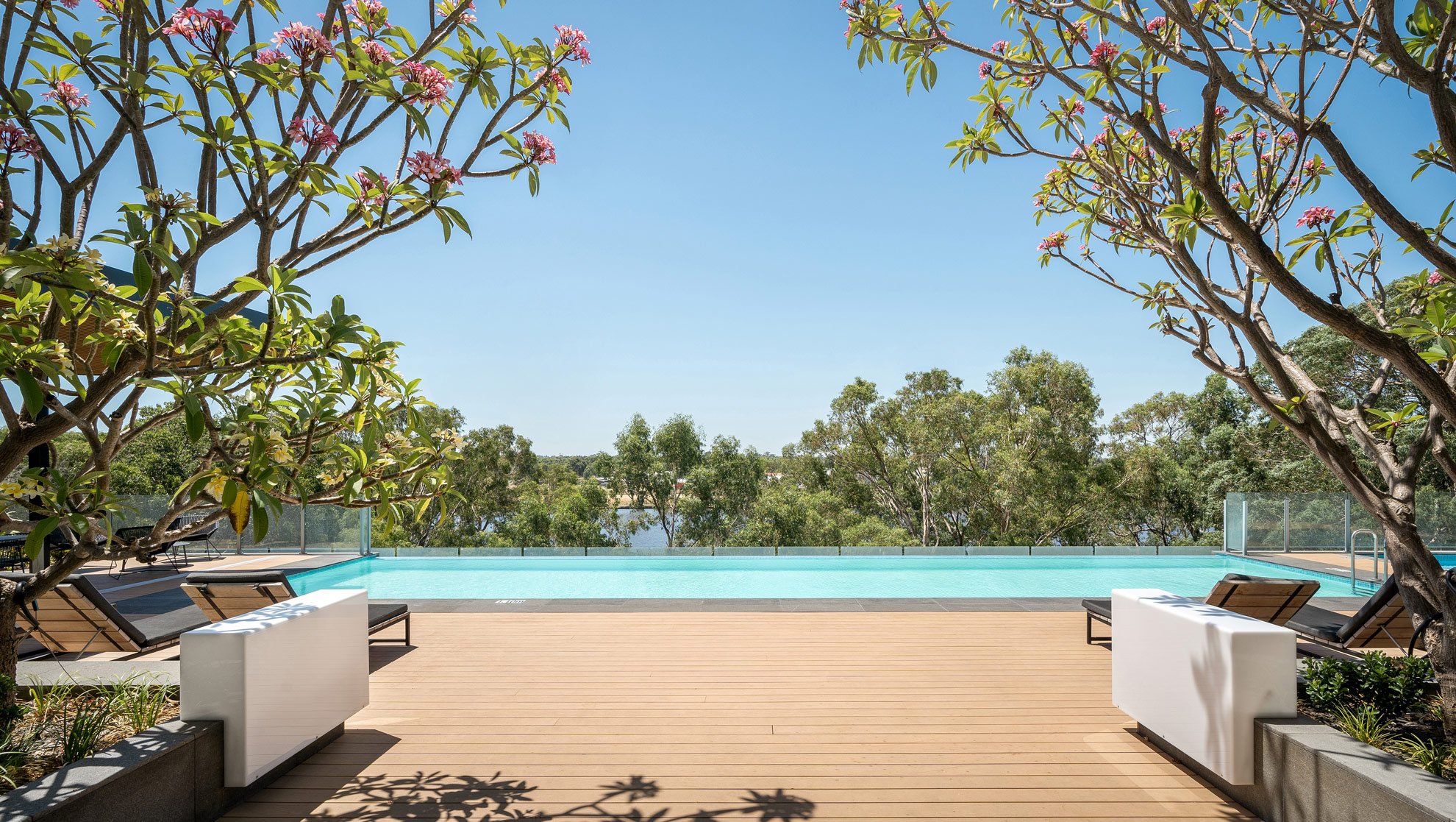Feel on top of the world with an expansive infinity edge pool which visually merges into the shimmering waters of the river below. Alongside the spectacular pool is a heated spa, fully equipped gymnasium and fitness centre with sauna and steam room.