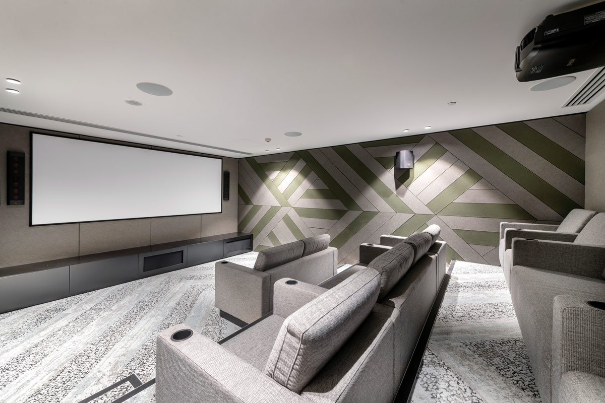 Acoustically insulated theatre room with HD display, equipped with tiered seating and a surround sound system.