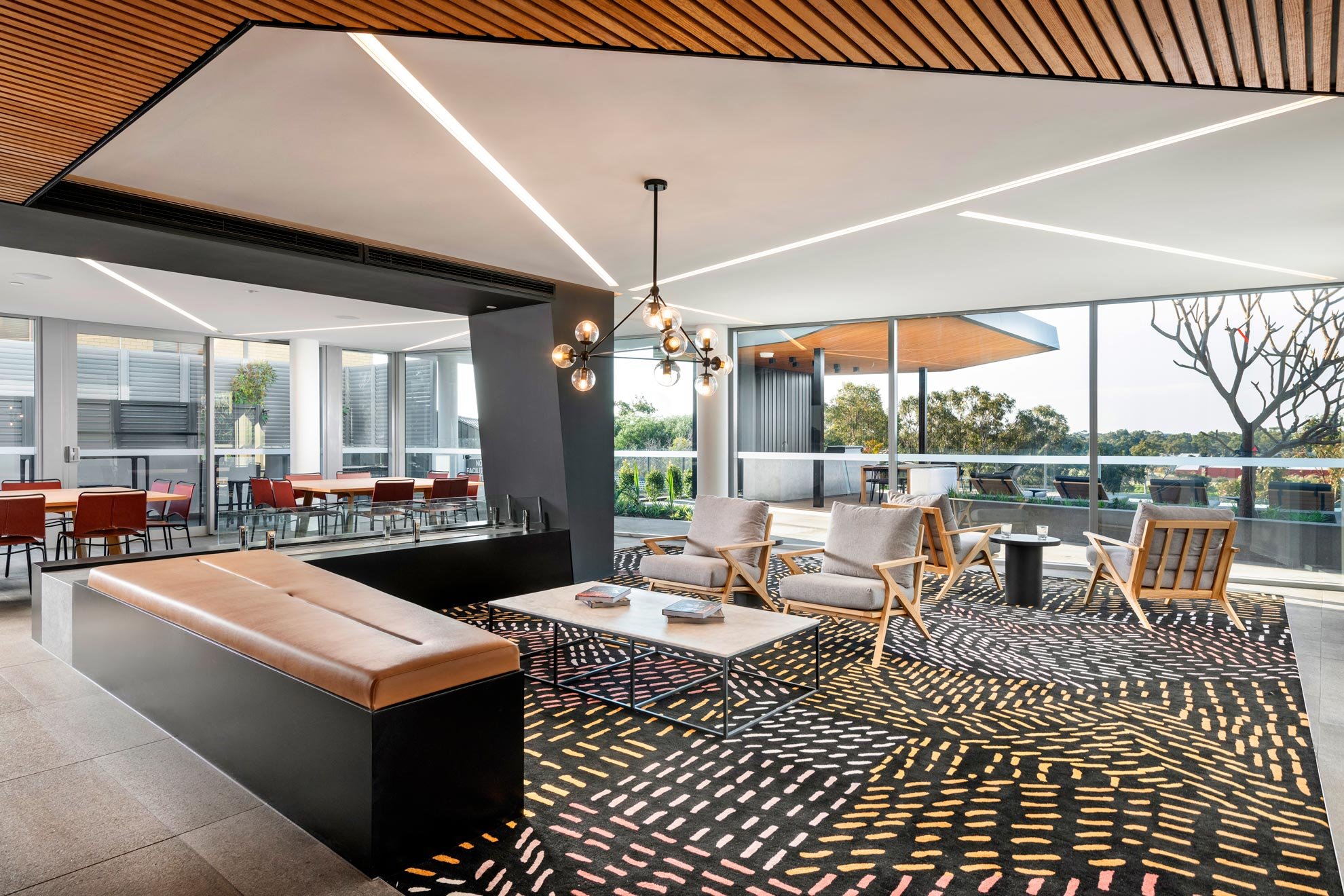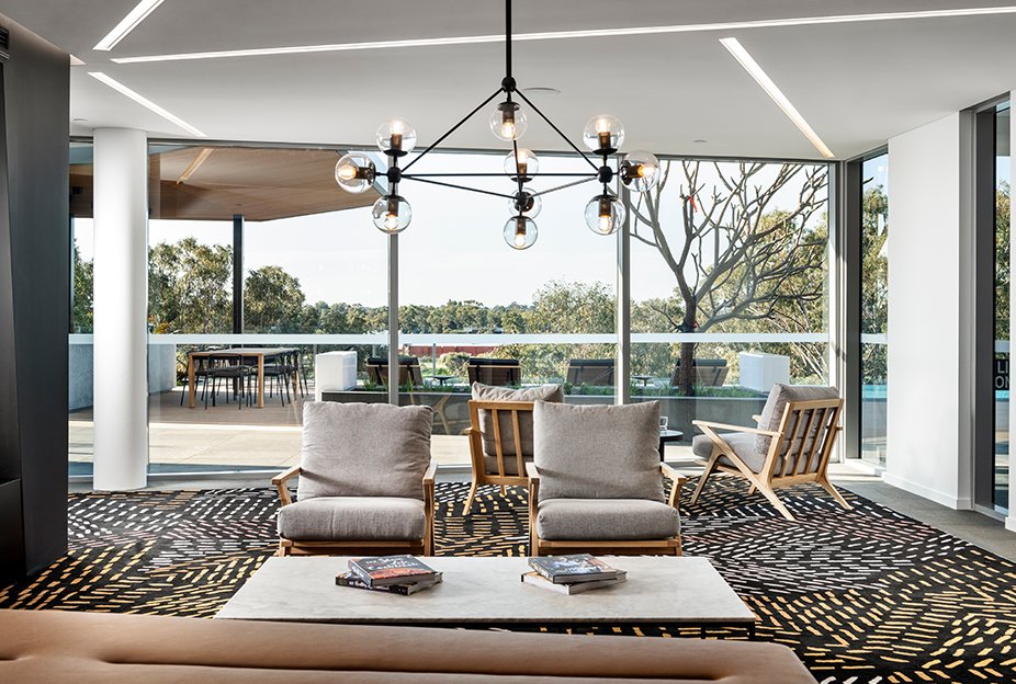 The residents’ lounge has a distinctive form that creates intimate spaces for private relaxation overlooking the magnificent pool.