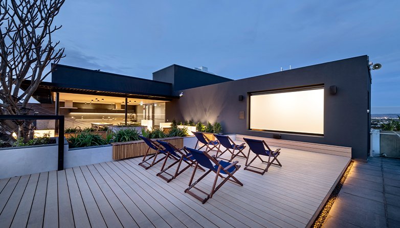 Relax on a balmy summer’s night, watching a classic movie under the stars against a backdrop of sparkling city lights reflecting on the river.